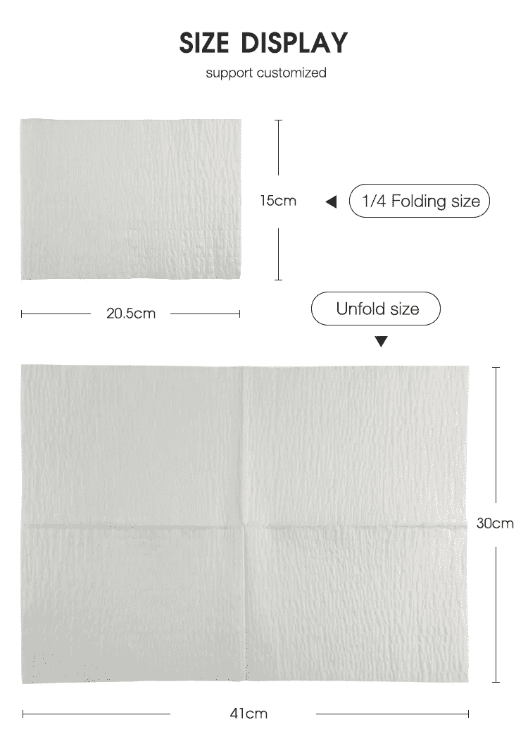 A: Размер 30 см × 40 см, трехслойная структура, 55 г на слой, идеально подходит для ежедневного одноразового использования.