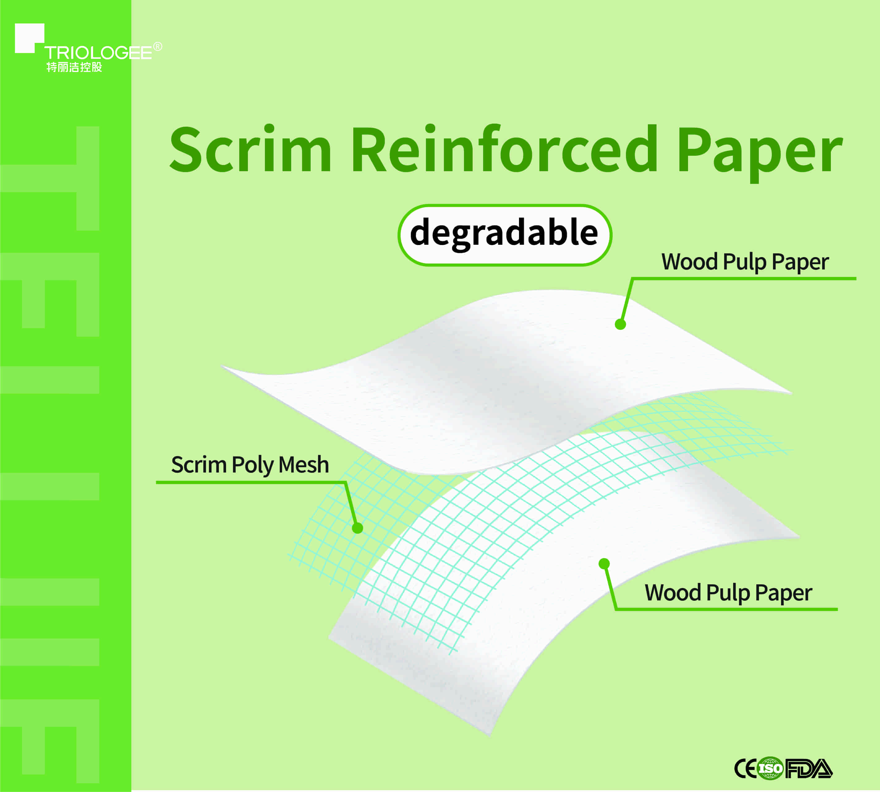 Hefei Telijie scrim reinforced paper is made of quality paper material with scrim reinforcement inside, making it strong and not easy to break when wet. This 3-ply 55g product comes in standard size 30cm×40cm, lightweight and cost-effective. With CE certification, it is safe and hygienic for both medical applications and daily household kitchen use, such as cleaning, wiping, absorbing oil and wrapping. It is a reliable disposable material for clinics, hospitals, home and catering places.